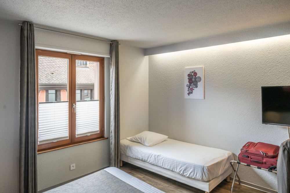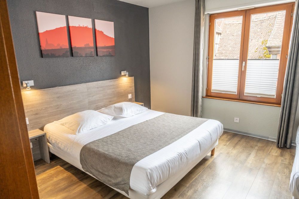 Réservez l’une de nos 17 chambres climatisées, avec vue sur la ville ou sur le vignoble. Profitez du confort de notre hôtel situé sur la Route des Vins d’Alsace à côté de Colmar.